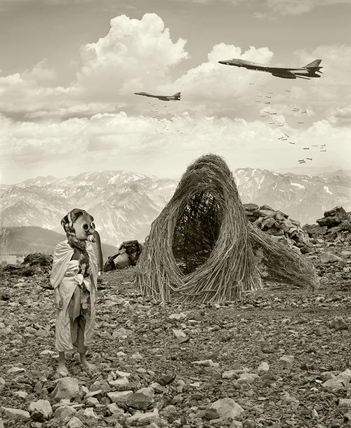 I construct stories that question themes in contemporary human experience by layering digital and analog photographic media, spaces, perspectives, objects, and moments of time and history. My son plays a recurring young character and “witness” to the events in each imagined scene, tapping into my own anxiety about all our children's futures.